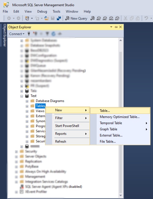 دیتابیس ایجاد شده را از لیست دیتابیس ها پیدا کنید روی اون کلیک کنید سپس روی عبارت Table راست کلیک کرده و گزینه اول NEW --> Table انتخاب نمایید