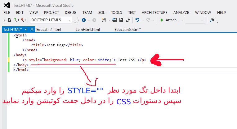 در این روش کدهای CSS را مستقیم داخل تگ های HTML قرار میدهیم. به مثال زیر توجه کنید