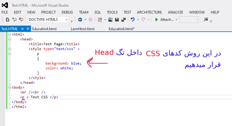 به عنوان مثال میتوانید کدهایی که در مثال CSS داخلی استفاده کردیم را درون فایلتان تایپ نمایید.